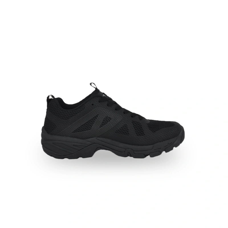 This is a pair of all-black outdoor sports shoes focusing on multi-functional outdoor scenarios. The upper is made of mesh material, balancing breathability and lightness. The all-black color scheme paired with geometric pattern design is minimalist and functional. The outsole has excellent grip, adapting to various outdoor terrains, and the shoe structure ensures stability during movement. The overall design is practical and versatile, suitable for outdoor hiking, daily sports and other activities, delivering a comfortable and understated wearing experience for users.