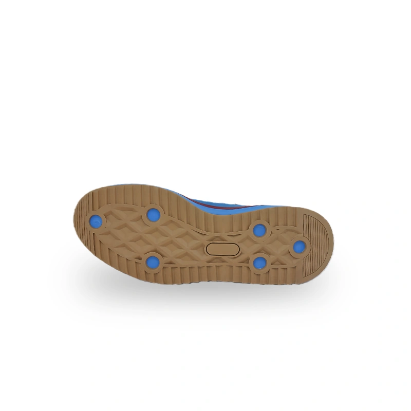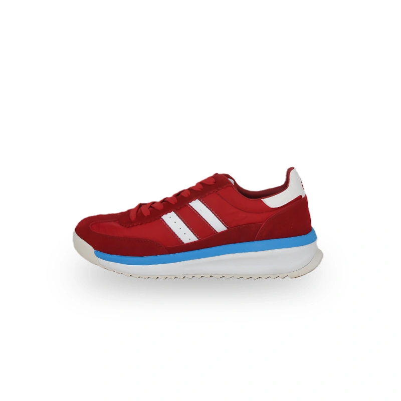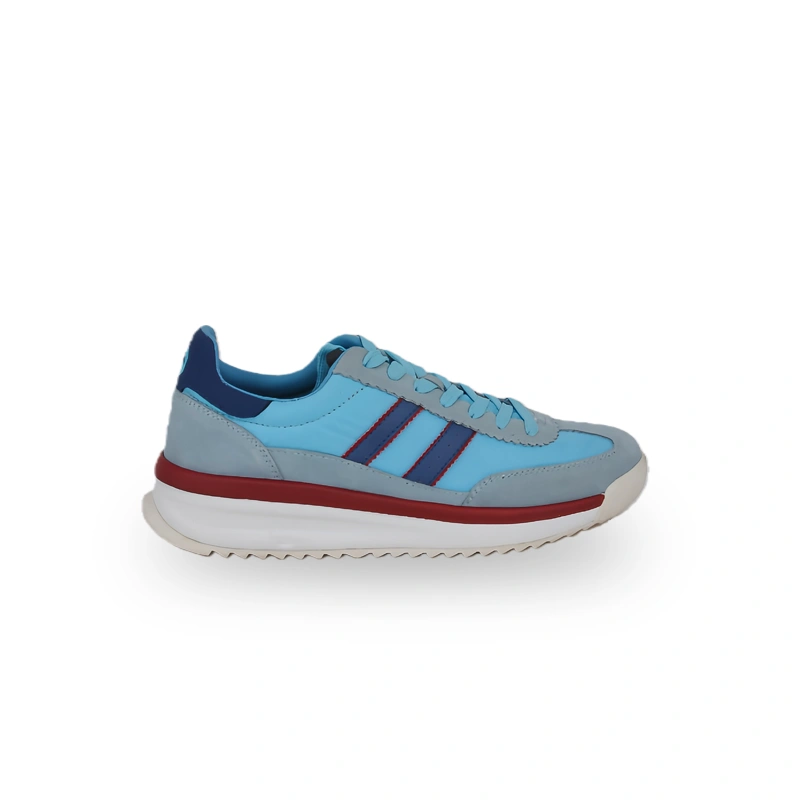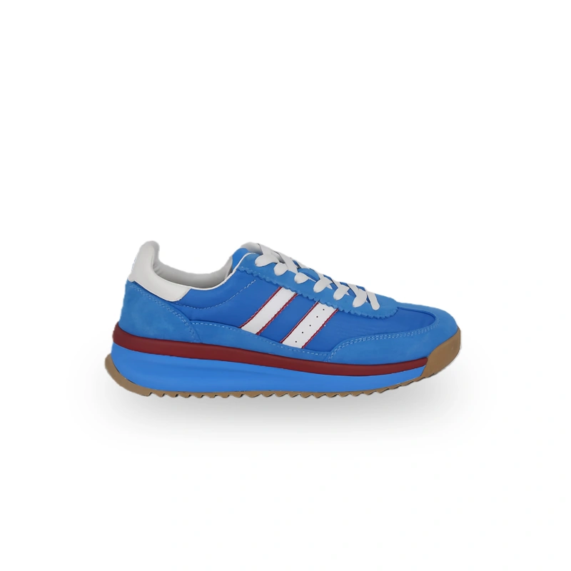 This is a pair of retro-style casual shoes with a design full of vitality and retro charm. The upper is mainly bright blue, paired with white stripes, red decorative strips, and an off-white sole. The color matching is vivid and layered. The classic stripe elements and thick sole design highlight the retro style, and the shoe shape has smooth lines. The overall style is suitable for consumers pursuing retro trends, and it is very suitable for daily casual wear or retro-style outfits, bringing a comfortable and personalized retro wearing experience to the wearer.