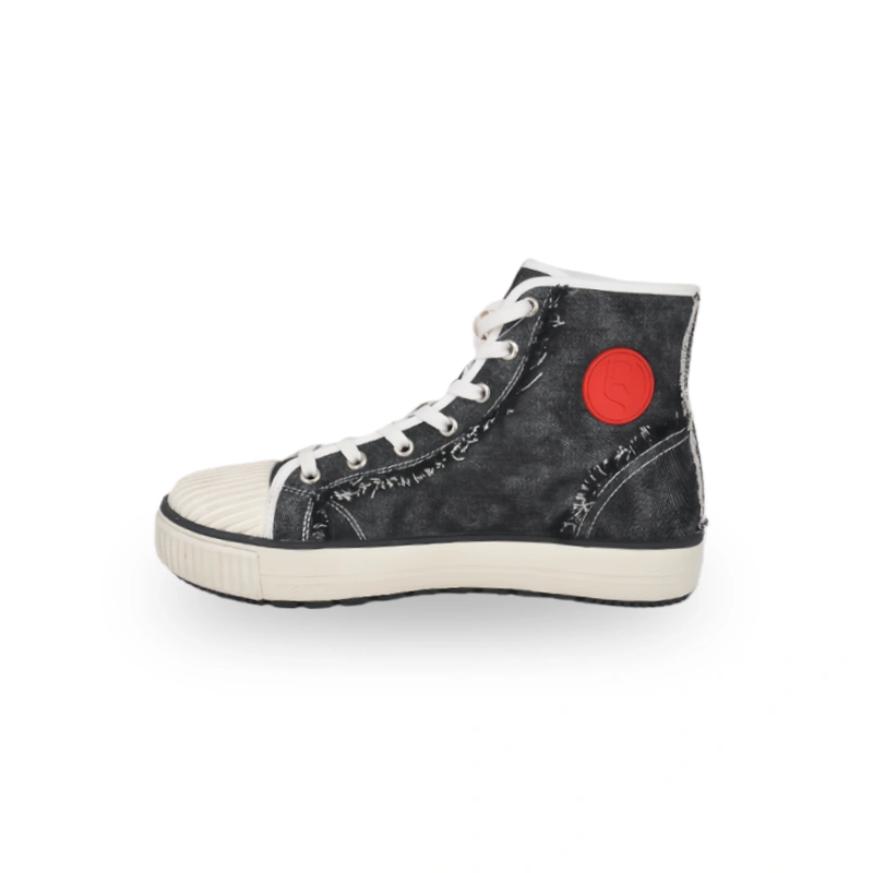 This is a pair of high-top canvas casual shoes with a retro distressed design. The upper is mainly made of distressed black-gray denim, paired with white shoelaces and an off-white sole. The worn details on the edges add a retro texture. The "DBA" logos on the side and heel highlight the brand's characteristics. The overall style is suitable for daily casual wear, and the retro distressed design makes it more personalized in trendy matching, bringing consumers a comfortable and retro-style wearing experience.