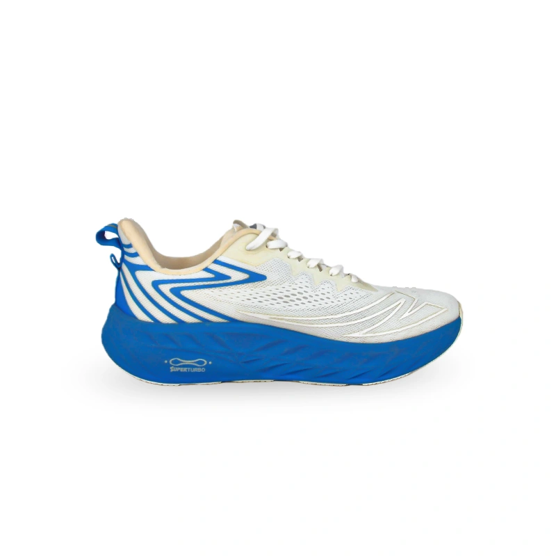 This is a pair of sports running shoes that combines fashion sense and sports performance. The upper is mainly white, paired with blue line decorations and a sole, creating a distinct and vibrant color contrast. The mesh upper ensures good breathability, and the blue line design on the side of the shoe is very dynamic, enhancing the overall fashion sense. The thick sole design not only provides a comfortable cushioning effect but also enhances the trendy sense of the shape. It is suitable for daily running or casual wear, bringing a comfortable and fashionable wearing option for sports enthusiasts.