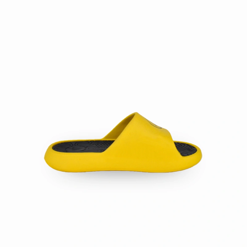 This is a pair of casual slippers with a vibrant and playful design. The upper is bright yellow, paired with a black insole featuring textured patterns for added grip. The minimalist slip-on style makes it convenient for daily wear, such as at home, by the pool, or for quick errands. It offers a comfortable and stylish experience, bringing a touch of liveliness to casual moments.
