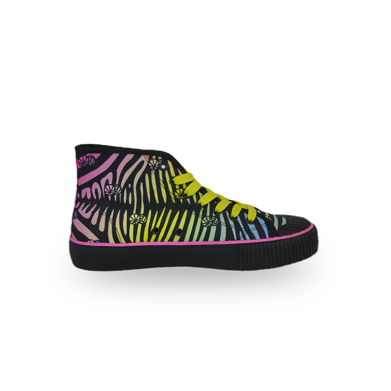 This is a pair of high-top casual shoes with a very trendy and artistic design. The upper features a colorful zebra stripe pattern, integrating rich colors such as black, pink, yellow, green, and blue, and is also dotted with personalized pattern elements, creating a strong visual impact. It is paired with bright yellow shoelaces, and the edge of the black sole is decorated with pink, making the overall color collision bold and vibrant. Notably, the "DBA" brand logo on the side of the sole supports custom replacement and can be replaced with an exclusive brand or pattern according to personal preferences, meeting the unique needs of personalized dressing. It is suitable for consumers pursuing avant-garde and trendy styles.