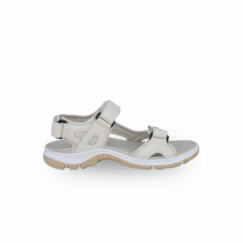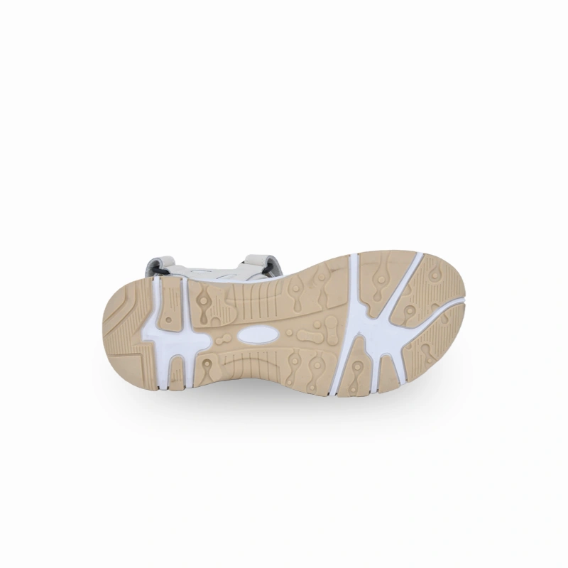 This is a pair of outdoor sandals with a practical and stylish design. The upper is light beige, featuring multiple adjustable Velcro straps for a customized and secure fit. The logos on the straps add recognition. The outsole combines a white midsole and a beige traction-focused design, making it suitable for various outdoor and casual scenarios. It balances comfort, adjustability, and durability, offering a reliable wearing experience for daily outings or light outdoor activities.