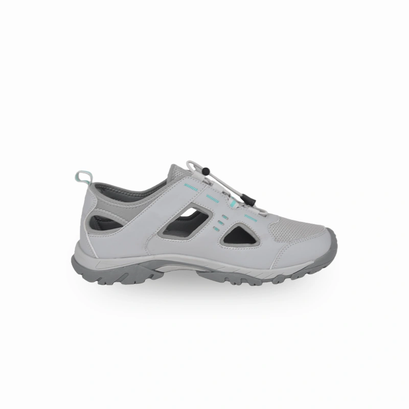 This is a pair of summer outdoor water shoes designed for amphibious scenarios. The upper is mainly gray, paired with turquoise detail accents, and the "WERNER" logo highlights the brand attribute. The hollow design and mesh material balance breathability and drainage, and the quick-lacing system facilitates wearing, taking off, and adjustment. The outsole has strong grip, adapting to slippery roads and various outdoor terrains. The overall design integrates functionality and practicality, making it suitable for water activities like stream trekking and hiking, delivering a comfortable and adaptable wearing experience for users.