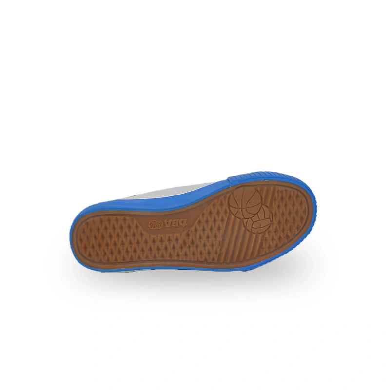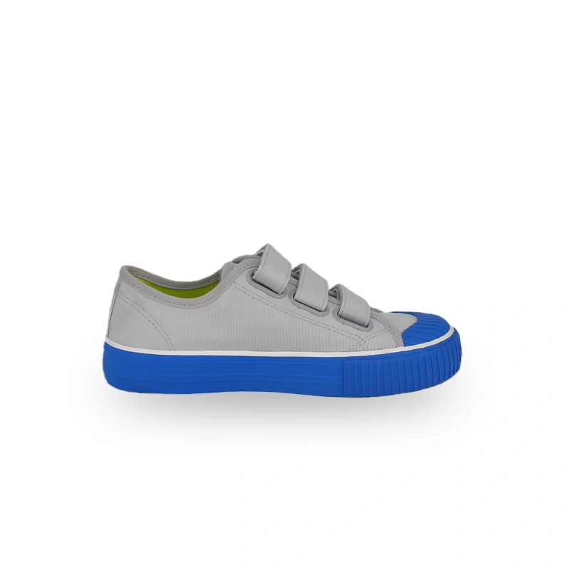 This is a pair of low-top casual shoes that combines practicality and fashion. The upper is mainly gray, paired with a blue toe cap and sole, and there are green details on the inner side of the shoe. The color matching is simple yet vibrant. It adopts a three-Velcro design, making it easy to put on and take off. Notably, the "DBA" brand logo on the side of the sole supports custom replacement, which can meet consumers' personalized brand or pattern needs, adding a sense of exclusivity to the outfit. It is suitable for people who pursue convenience and personality.