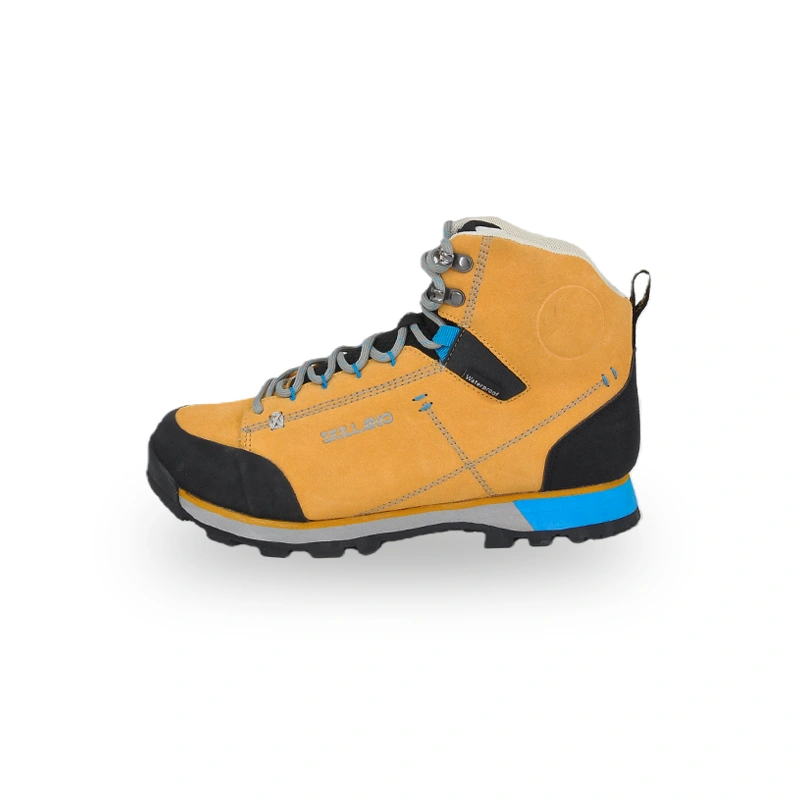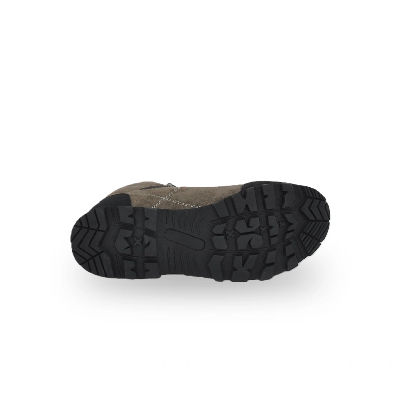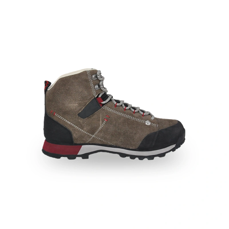 This is a pair of hiking boots designed for outdoor adventures. The upper is made of brown suede, paired with black and red accents, featuring durable metal eyelets and laces for a secure fit. The branding and reinforced toe cap highlight its functional design. With a rugged outsole, it provides excellent traction and support, making it suitable for hiking and other outdoor activities. It offers the wearer a combination of comfort, durability, and style for tackling various terrains.